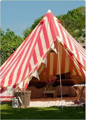 Luxury striped bell tent with heavy duty 540gsm waterproof PVC zipped in ground sheet.