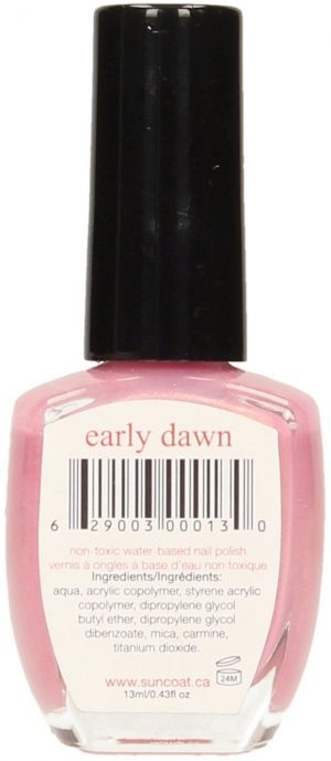 Free of chemical solvents The revolutionary water-based nail polishes from Suncoat are free of chemical solvents (toluene, acetates, formaldehyde, etc.). They contain about 70% water which evaporates after application without releasing chemical vapors. The nail polishes from Suncoat are environmentally friendly do not dry out the nails are virtually odorless are non-flammable containing only mineral and natural pigments Application: Before use, your nails should be clean, dry and free of grease. Clean your nails with soap and water and do not use hand lotion before applying nail polish. Since the nail polish from Suncoat doesn’t dry out your nails, you do not need a base coat. For the nail polish to last as long as possible, wear it as thin as possible in several layers. Two or more layers provide a comprehensive, long-stick finish. Let each coat dry for at least 30 seconds before you apply the next coat. If the nail polish is too thick, add a drop or two of water and shake the bottle well before each use. The additional application of the transparent Suncoat Clear Top Coat Nail Polish prolongs wearing time by two to three days. In the first hours after application, do not immerse hands in water for a long time. Normal showering or washing your hands is only possible an hour after application. Contact with very hot water should be avoided for four hours after application. Remove the nail polish after a week to avoid any pigments settling on the nail. To do this, use the Suncoat Nail Polish Remover. Alternatively, you can also dip your nails in hot water for two minutes. Let the nail polish dissolve and peel the polish off at the corners. After opening, use within a year. Store in a cool, dry place and keep out of reach of children. Ingredients (INCI): Main ingredients: Aqua (water, ~65% in formula), acrylate copolymer / styrene-acrylate copolymer (~28% in formula) Other ingredients (all under 4%): propylene glycol n-butyl ether, dipropylene glycol dibenzoate. Pigments/colorant: may contain [+/-] mica (CI 77019), titanium dioxide (CI 77891), ferric ferrocyanide, iron oxide (CI 77491, CI 77492, CI 77499), chromium oxide (CI 77288), carmine (CI 75470)
