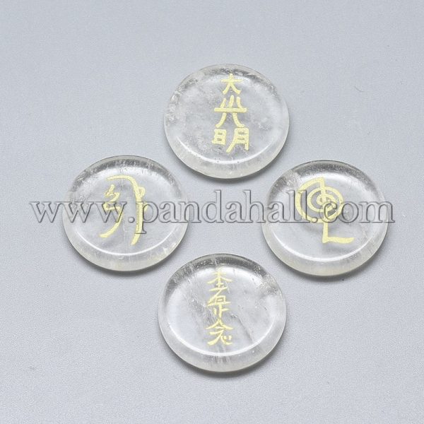 Synthetic Quartz Crystal Cabochons, Flat Round with Buddhist Theme Pattern, Size: about 25mm in diameter, 5.5mm thick; 4pcs/set.