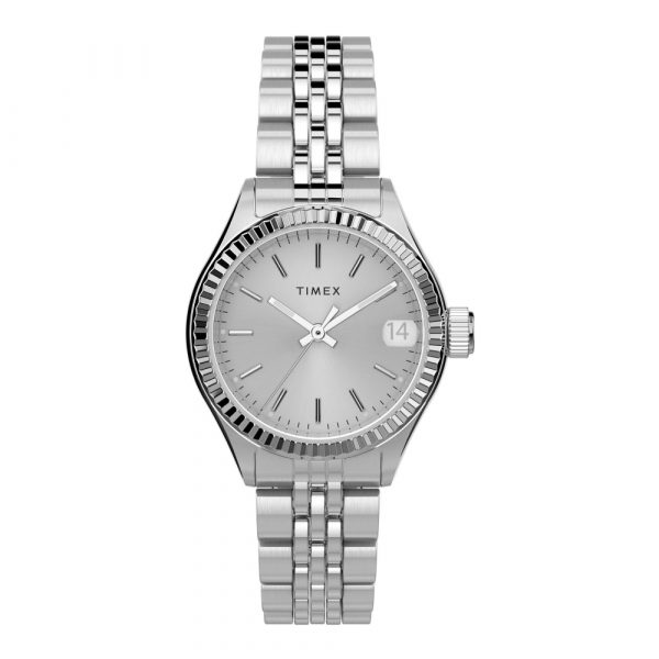 Case Width: 24 mm Case Height: 10 mm Case Material: Stainless Steel Band Colour: Silver Tone Buckle/Clasp: Clasp (Deployment) Case Colour: Silver-Tone Case Finish: Brushed/Polished Case Shape: Round Crystal/Lens: Mineral Glass Dial Colour: Silver-Tone Dial Markings: Markers (Full) Watch Movement: Quartz Analogue Water Resistance: 50 meters Strap and Lug Width: 16 mm Attachment Hardware Colour: Silver-Tone There’s strength in tradition. We’re honouring our 1854 roots as the Waterbury Clock Company and the strong women who created our earliest timepieces. A testament to our commitment to craftsmanship and honoring our original watchmakers, this watch with its stainless steel case and bracelet, Silver-tone dial and an elegant fluted stainless steel bezel is well-suited for everyday wear..
