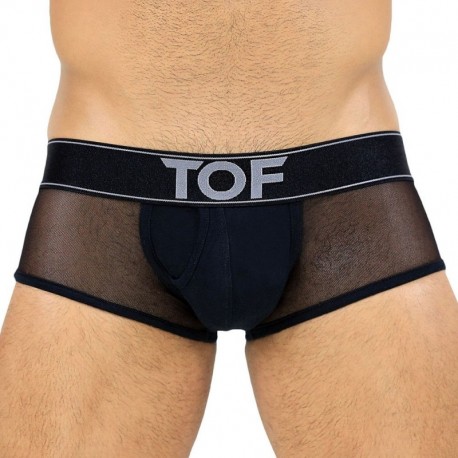 Low-rise boxer made from soft and comfortable cotton. See-through mesh yokes on the front. Very sexy and elegant fitted cut. Open front pouch. TOF satin elastic waistband.