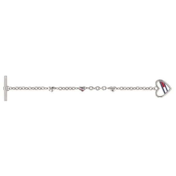 Ladies open heart bracelet from Tommy Hilfiger. Featuring a silver tone heart charm with 3 smaller hearts along its length , toggle clasp closure.