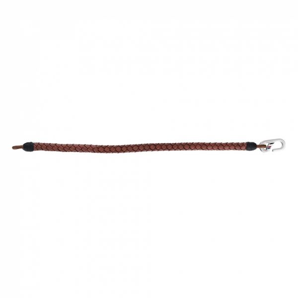 Men’s braided leather hook bracelet from Tommy Hilfiger. Light brown leather braided with stainless steel hook closure with enamel Tommy stripe and thread wrapped leather cord.