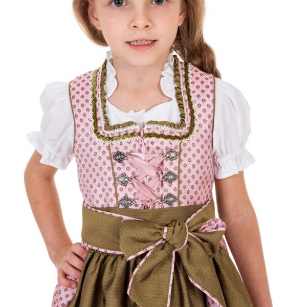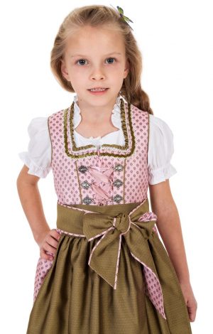 Traditional dirndl for little girls. The pink children’s dirndl by Krüger consists of three parts. The white short-sleeved blouse has pretty puffed sleeves and a ruched traditional-style neckline. Little girls are wearing the medium-length dirndl with cross-tied decorative band and contrasting flowers. Particularly attractive is the typical apron for a dirndl in warm golden brown. It has a big bow that girls love especially. A border on the lower hem repeats the pattern of the traditional dress.