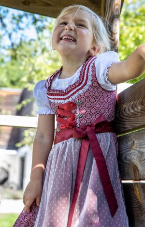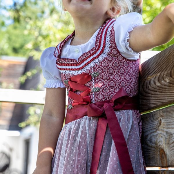 Authentic children’s dirndl. The three-part MURNA KIDS children’s dirndl by Marjo impresses with a blood-red, patterned dress, white puffed sleeved blouse and also a white, slightly transparent apron with a red tie. The heart-shaped neckline framed with braid and the red bodice straps attached with silver traditional buttons round off the picture successfully. Ballerinas will look great in it.
