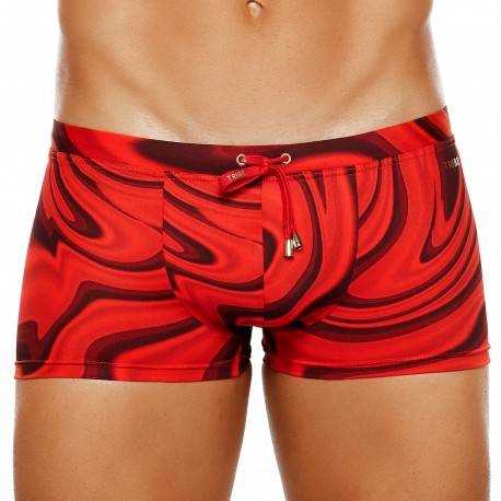 Slim-fit and low-rise swim trunk made from soft microfiber. Chloroban fabric featuring chlorine and UV protection for a high level of color stability. Vibrant abstract pattern in red gradation. Simple and elegant cut offering comfort and support. Fully lined. Elastic waistband with drawstring. Tribe logo on the left hip. Made in Australia.