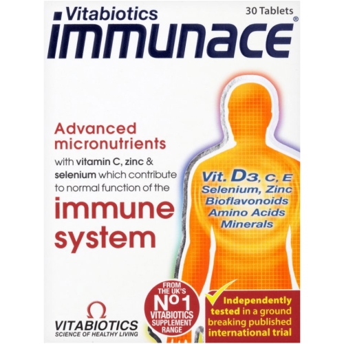 Vitabiotics Immunace Capsules Research shows that sometimes our diets are unbalanced and some of us may not always be getting the nutrients required to maintain a strong and efficient immune system. Vitabiotics Immunace Capsules are a synergistic dietary supplement of 24 nutrients for the immune system, to help maintain every day healthy immune resistance and optimal cell defence. Antioxidants such as vitamins E, C and carotenoids, help defend against harmful free radicals which can damage cell DNA. Certain amino acids and trace minerals such as selenium are also used in the synthesis of more complex antioxidant molecules. Free radicals are found naturally in the environment, caused by sunlight, cigarette smoke, pollution, and other factors in modern day-to-day existence. Vitabiotics Immunace Capsules includes antioxidant vitamins, trace minerals, amino acids and five natural source carotenoids to help ensure comprehensive antioxidant defence. Vitabiotics Immunace Capsules provides a comprehensive range of vitamins and minerals, taking the place of a regular multivitamin / mineral supplement. These include nutrients for all-round wellbeing, as well as vitamin B complex for the maintenance of the central nervous system, which helps to maintain immune response.Immunace provides a comprehensive formula for the immune system, with effective levels of antioxidants. Vitamin C and E circulate in the body to help protect against the damage caused by free radicals. Other nutrients such as betacarotene protect DNA and cells from within. Immunace helps safeguard nutrients required for: * The short term – to help maintain your immune resistance. It also helps replace the vitamin C lost during colds. * The long term – to increase the body’s level of protective substances for long term cell protection. Directions One tablet per day with your main meal. Swallow with a glass of water or a cold drink. Not to be chewed. Do not exceed the recommended intake. Vitabiotics Immunace Capsules should only be taken on a full stomach. No artificial colours No gluten No preservatives No salt or yeast Not tested on animals Suitable for vegetarians Formula