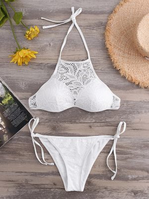 Be the first to review “White Lace Self-tie Design Halter Sleeveless Bikini Set”