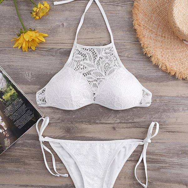 White Lace Self-tie Design Halter Sleeveless Bikini Set