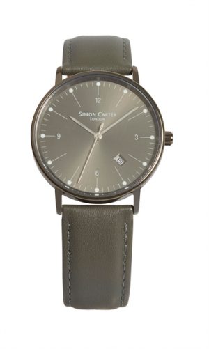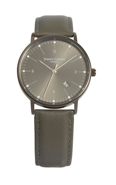 A new form of WT2201 with a gunmetal finish and grey face. An elegant watch with long, shapely hands, needle-like main indices with luminous dots on top, discreet numerals and the bevelled inset date window artfully, and unusually set at an angle between the 4 and 5. Has a high quality padded leather strap in grey. 5mm deep. 5 ATM.