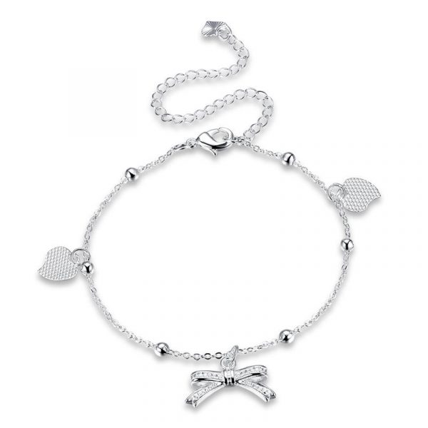 YUEYIN 925 Silver Plated Anklet Bracelet Sweet Heart Bowknot Pendant Sandal Foot Chain
